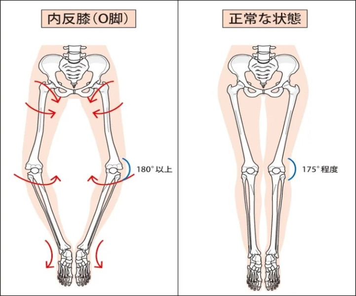 足首が過剰に内側へ倒れる(過回内)と、脛骨が内旋し、それに伴って大腿骨は外旋方向にねじられます。このねじれの結果、膝関節は外側へ開き、見た目としてO脚を形成します。